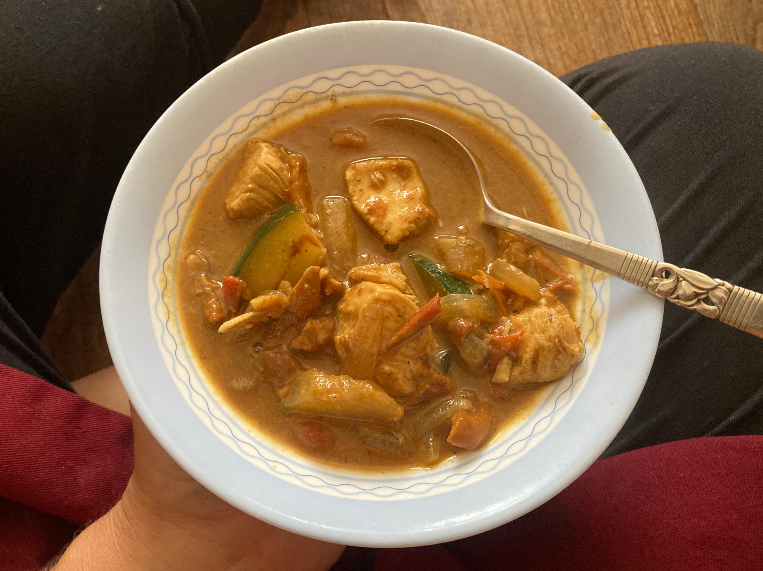 I am grateful for her foresight.And I am sitting on my kitchen floor now, thinking about all the time wasted and invested in the distraction of chasing men who told me they didn't like to eat leftovers.I am sitting on my kitchen floor, indignantly judging them, thinking things like, "clearly they do not know what it is like to run a household," or "are their daily take out meals better than my jars of curry?"And clearly, I forget the fact that I'm menstruating, and my perseverance is fulled by this further.And I am sitting on my kitchen floor, and now I am licking the curry juice off my finger, as it is running towards my wrist, and then take that finger and swipe the plate clean, indulging in the flavors, further set into the chicken and zucchini, as it's been in the fridge for several days now.I begin to laugh at myself recognizing that such reflection on what I'm trying to confabulate into red flags I blew past, is just pulling me from this moment; pulling me from being able to savor every little bit of spice that I am.I tuck the rest of the jar back into the fridge for tomorrow, making sure that I have another brioche bun left over to sop up all the goodness that the maturity of waiting can only entertain.
